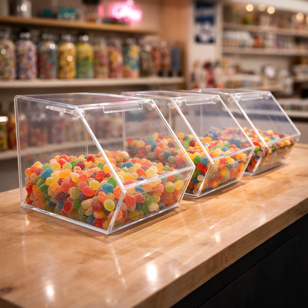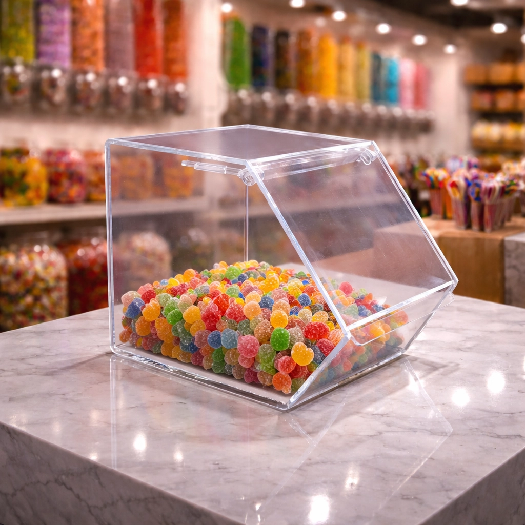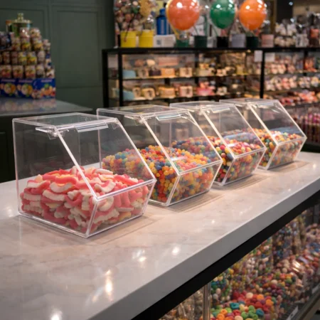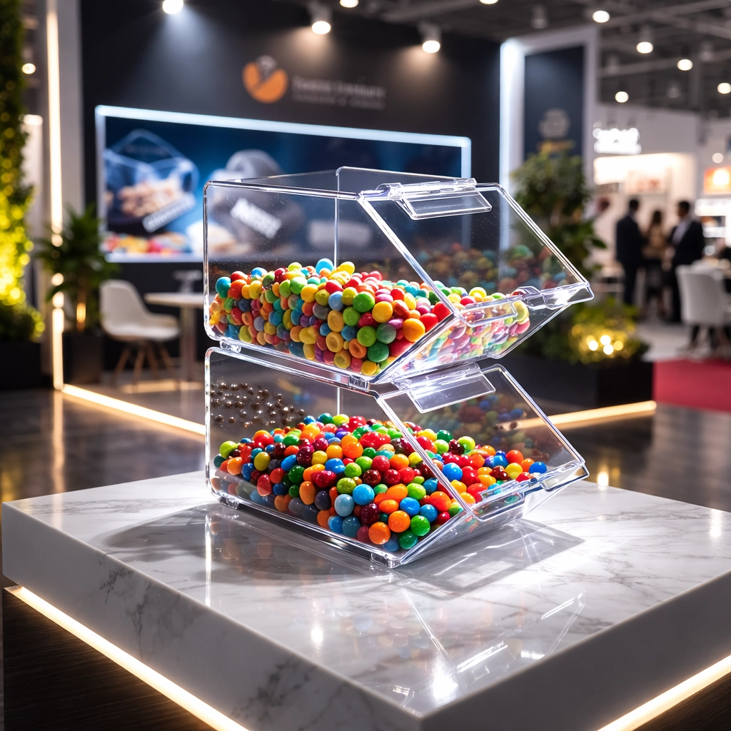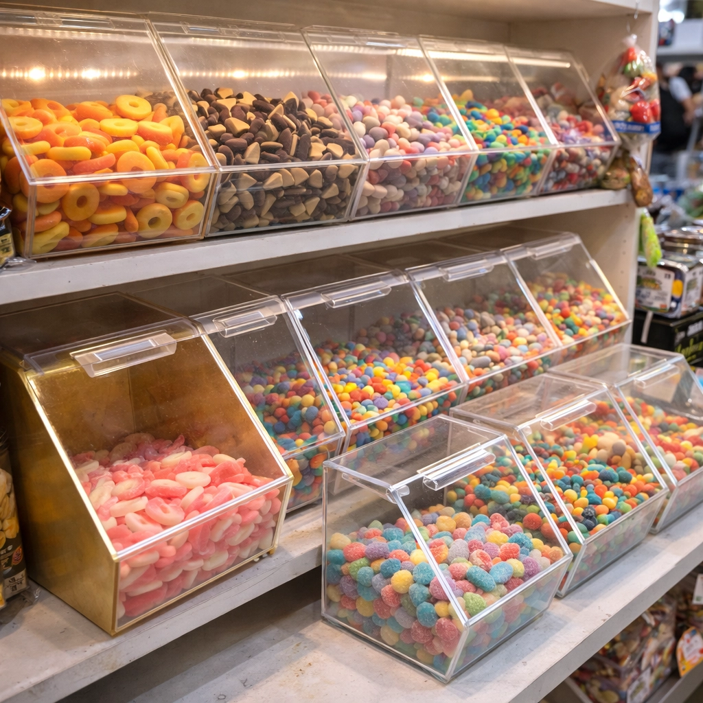 مدل کشویی یا پیمانهدار برای فروش حجمی پاستیل بسیار کاربردی است. این مدل باعث میشود برداشت محصول کنترلشدهتر باشد و سرعت سرویسدهی افزایش پیدا کند. بسیاری از فروشگاههای مدرن از این مدل برای ایجاد تجربه خرید بهتر استفاده میکنند.